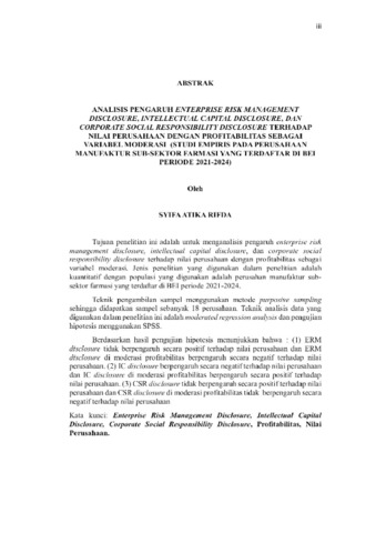 Tujuan penelitian ini adalah untuk menganalisis pengaruh enterprise risk management disclosure, intellectual capital disclosure, dan corporate social responsibility disclosure terhadap nilai perusahaan dengan profitabilitas sebagai variabel moderasi. Jenis penelitian yang digunakan dalam penelitian adalah kuantitatif dengan populasi yang digunakan adalah perusahan manufaktur sub-sektor farmasi yang terdaftar di BEI periode 2021-2024. Teknik pengambilan sampel menggunakan metode purposive sampling sehingga didapatkan sampel sebanyak 18 perusahaan. Teknik analisis data yang digunakan dalam penelitian ini adalah moderated regression analysis dan pengujian hipotesis menggunakan SPSS. Berdasarkan hasil pengujian hipotesis menunjukkan bahwa : (1) ERM disclosure tidak berpengaruh secara positif terhadap nilai perusahaan dan ERM disclosure di moderasi profitabilitas berpengaruh secara negatif terhadap nilai perusahaan. (2) IC disclosure berpengaruh secara negatif terhadap nilai perusahaan dan IC disclosure di moderasi profitabilitas berpengaruh secara positif terhadap nilai perusahaan. (3) CSR disclosure tidak berpengaruh secara positif terhadap nilai perusahaan dan CSR disclosure di moderasi profitabilitas tidak berpengaruh secara negatif terhadap nilai perusahaan Kata kunci: Enterprise Risk Management Disclosure, Intellectual Capital Disclosure, Corporate Social Responsibility Disclosure, Profitabilitas, Nilai Perusahaan.