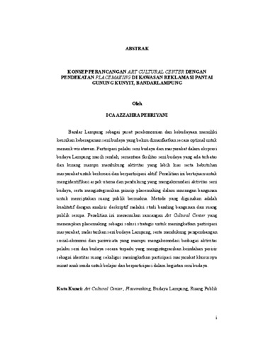 Ica , Azzahra Pebriyani (2025) KONSEP PERANCANGAN ART CULTURAL CENTER DENGAN PENDEKATAN PLACEMAKING DI KAWASAN REKLAMASI PANTAI GUNUNG KUNYIT, BANDARLAMPUNG. TEKNIK, UNIVERSITAS LAMPUNG.