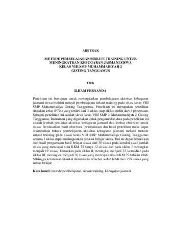 Penelitian ini bertujuan untuk meningkatkan pembelajaran aktivitas kebugaran jasmani siswa melalui metode pembelajaran sirkuit training pada siswa kelas VIII SMP Muhammadiya Gisting Tanggamus. Penelitian ini merupakan penelitian tindakan kelas (PTK) yang terdiri dari 3 siklus, tiap siklus terdiri dari 1 pertemuan. Sebujek penelitian ini adalah siswa kelas VIII SMP 2 Muhammadiyah 2 Gisting Tanggamus. Instrumen yang digunakan untuk pengambilan data pada penelitian ini adalah lembah penilaian aktivitas kebugaran jasmani dan lembar observasi untuk siswa. Berdasarkan hasil observasi, pembahasan dan hasil penelitian maka dapat disimpulkan bahwa pembelajaran aktivitas kebugaran jasmani melalui metode sirkuit training pada siswa kelas VIII SMP Muhammadiya Gisting Tanggamus selama 3 siklus dapat meningkatkan prestasi belajar siswa. Hal ini dapat dibuktikan dari hasil pengamatan hasil belajar siswa dari 30 siswa pada kondisi awal jumlah siswa yang mencapai nilai KKM 75 hanya 12 siswa, dan pada siklus I meningkat menjadi 19 siswa , kemudian pada siklus II, meningkat menjadi 22, kemudian pada siklus III, meningkat menjadi 26 siswa yang mencapai nilai KKM 75 bahkan lebih. Sehingga ketuntasan klasikal dalam kelas tersebut sudah lebih dari 75% siswa yang tuntas belajar Kata kunci: metode pembelajaran, sirkuit training, kebugaran jasmani This study aims to improve students' physical fitness learning through circuit training methods in grade VIII students at SMP Muhammadiya Gisting Tanggamus. This study is a classroom action research (CAR) consisting of 3 cycles, each cycle consisting of 1 meeting. The subjects of this study were grade VIII students at SMP 2 Muhammadiyah 2 Gisting Tanggamus. The instruments used to collect data in this study were physical fitness assessment sheets and observation sheets for students. Based on the results of observations, discussions, and research findings, it can be concluded that physical fitness learning through the circuit training method for eighth-grade students at SMP Muhammadiya Gisting Tanggamus over three cycles can improve student learning achievement. This can be proven from the observation of students' learning outcomes from 30 students. At the beginning, only 12 students achieved a score of 75, which is the minimum passing grade (KKM). In cycle I, this number increased to 19 students, then in cycle II, it increased to 22, and in cycle III, it increased to 26 students who achieved a score of 75 or higher. Thus, the classical completion rate in that class has exceeded 75%. Keywords: methods, circuit training, physical fitness