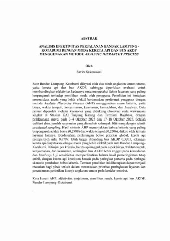 SAVIRA, SUKMAWATI (2026) ANALISIS EFEKTIVITAS PERJALANAN BANDAR LAMPUNG - KOTABUMI DENGAN MODA KERETA API DAN BUS AKDP MENGGUNAKAN METODE ANALYTIC HIERARCHY PROCESS. FAKULTAS TEKNIK, UNIVERSITAS LAMPUNG.