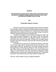 Masalah di lom penelitiyan hinji iyulah gohpa makna konotatip sai wat di sastra lisan Pepancogh masarakat Lampung Pubiyan Marga Pugung serta gohpa implikasini tehadap pembelajaran bahasa Lampung di SMP. Penelitiyan hinji betujuwan guwai ngedeskripsiko makna konotatip sai wat di delom sastra lisan Pepancogh rik ngejelasko implikasini tehadap pembelajaran bahasa Lampung di SMP. Penelitiyan hinji ngegunako metode kuwalitatip deskriptip jama sumber data anjak inporman penyusun Pepancogh rik data utamani iyulah teks Pepancogh. Pengumpulan data delom penelitian hinji negegunako obserpasi, wawancara, rik dokumentasi delom bentuk teks Pepancogh. Kemudiyan data sai tekuppul dianalisi ngegunako model Miles rik Huberman, iyulah mulai anjak reduksi data, penyajian data, rik narik simpulan. Hasil penelitiyan hinji anjak telu teks Pepancogh sai dianalisis, iyulah anjak Kelama (puwari ragah anjak ibu), Batangan (hulun tuha ataw tuan mahan), rik Lebu (puwari ragah atu anjak ibu), ditemuko total 25 data makna konotatip. Rinciyanni, Pepancogh Kelama (13 data), Pepancogh Batangan (5 data), rik Pepancogh Lebu (7 data). Makna konotatip sai ditemuko tebagi jadi ruwa jenis, iyulah makna konotatip ranggal, rik makna konotatip ramah. Hasil penelitiyan hinji diimplikasiko haguk pembelajaran delom bentuk Rencana Pelaksanaan Pembelajaran (RPP), serta implikasi pembelajaran hinji ditunjukkan delom pembelajaran bahasa Lampung di SMP. Kata Kunci: makna konotatip, Pepancogh, implikasi pembelajaran