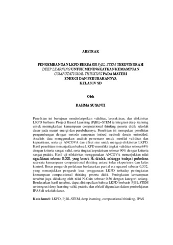 RAHMA , SUSANTI (2026) PENGEMBANGAN LKPD BERBASIS PjBL-STEM TERINTEGRASI DEEP LEARNING UNTUK MENINGKATKAN KEMAMPUAN COMPUTATIONAL THINKING PADA MATERI ENERGI DAN PERUBAHANNYA KELAS IV SD. Masters thesis, UNIVERSITAS LAMPUNG.