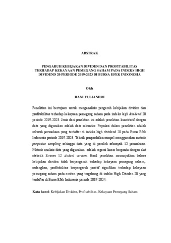 YULIANDRI, RANI (2025) PENGARUH KEBIJAKAN DIVIDEN DAN PROFITABILITAS TERHADAP KEKAYAAN PEMEGANG SAHAM PADA INDEKS HIGH DIVIDEND 20 PERIODE 2019-2023 DI BURSA EFEK INDONESIA. FAKULTAS EKONOMI DAN BISNIS, UNIVERSITAS LAMPUNG.