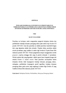 Penelitian ini bertujuan untuk menganalisis pengaruh kebijakan dividen dan profitabilitas terhadap kekayaan pemegang saham pada indeks high dividend 20 periode 2019-2023. Jenis dari penelitian ini adalah penelitian kuantitatif dengan data yang digunakan adalah data sekunder. Populasi dalam penelitian adalah seluruh perusahaan yang terdaftar di indeks high dividend 20 pada Bursa Efek Indonesia periode 2019-2023. Teknik pengambilan sampel menggunakan metode purposive sampling sehingga data yang di peroleh sebanyak 12 perusahaan. Metode analisis data yang digunakan adalah regresi linear berganda dengan alat statistik Eviews 12 student version. Hasil penelitian menunjukkan bahwa kebijakan dividen tidak berpengaruh terhadap kekayaan pemegang saham,. sedangkan, profitabilitas berpengaruh positif signifikan terhadap kekayaan pemegang saham pada emiten yang tergabung di indeks High Dividen 20 yang terdaftar di Bursa Efek Indonesia periode 2019-2024. Kata kunci: Kebijakan Dividen, Profitabilitas, Kekayaan Pemegang Saham This study aims to analyze the effect of dividend policy and profitability on shareholder wealth in the High Dividend 20 Index for the 2019–2023 period. The type of this research is quantitative research, and the data used are secondary data. The population in this study consists of all companies listed in the High Dividend 20 Index on the Indonesia Stock Exchange for the 2019–2023 period. The sampling technique uses purposive sampling, resulting in data obtained from 12 companies. The data analysis method used is multiple linear regression with the EViews 12 student version statistical tool. The results of the study show that dividend policy has no effect on shareholder wealth, whereas profitability has a significantly positive effect on shareholder wealth in issuers included in the High Dividend 20 Index listed on the Indonesia Stock Exchange for the 2019–2024 period. Keywords: Dividend Policy, Profitability, Shareholder Wealth
