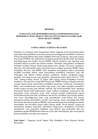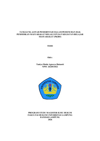 Taniya , Hutasoit (2026) TANGGUNG JAWAB PEMERINTAH DALAM PEMENUHAN HAK PENDIDIKAN MASYARAKAT MELALUI PUSAT KEGIATAN BELAJAR MASYARAKAT (PKBM). Masters thesis, UNIVERSITAS LAMPUNG.