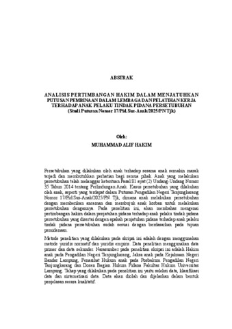 MUHAMMAD, ALIF HAKIM (2026) ANALI S I S PERTI MBANGAN HAKI M DALAM MENJ ATUHKAN PUTUSAN PEMBINAAN DALAM LEMBAGA DAN PELATIHAN KERJA TERHADAP ANAK PELAKU TINDAK PIDANA PERSETUBUHAN (Studi Putusan Nomor 17/Pid.Sus-Anak/2025/PN Tjk). FAKULTAS HUKUM, UNIVERSITAS LAMPUNG.