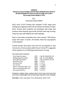 Pabrik Aseton (C3H6O) berbahann baku isopropanol (C3H8O) dengan proses dehidrogenasi menggunakan katalis Cu/Pt, direncanakan akan didirikan di Cilegon, Banten. Pendirian pabrik berdasarkan atas pertimbangan dekat dengan akses pemasaran, sarana transportasi yang memadai, kebutuhan utilitas yang mencukupi, tenaga kerja yang mudah didapatkan dan kondisi lingkungan. Pabrik ini direncanakan memproduksi aseton Aseton sebanyak 15.000 ton/tahun, dengan waktu operasi 24 jam/hari, 330 hari/tahun. Bahan baku yang digunakan berupa isopropanol. Penyedia kebutuhan utilitas pabrik Aseton terdiri dari unit pengolahan air, udara tekan dan steam. Bentuk perusahaan adalah Perseroan Terbatas (PT) menggunakan struktur organisasi Line and Staff dengan jumlah karyawan 164 orang. Dari analisis ekonomi diperoleh : Fixed Capital Investment (FCI) = Rp. 301.568.650.165,518 Working Capital Investment (WCI) = Rp. 53.217.997.088,032 Total Capital Investment (TCI) = Rp. 354.786.647.253,550 Break Event Point (BEP) = 31,30 % Shut Down Point (SDP) = 15,47 % Pay Out Time (POT)a = 2,1 tahun Return on Investment before taxes (ROI)b = 39,883 % Return on Investment after taxes (ROI)a = 31,906 % Discounted Cash Flow (DCF) = 32,53 % Berdasarkan ringkasan diatas, pendirian pabrik Aseton layak untuk dikaji lebih lanjut karena menguntungkan dan memiliki prospek yang baik di masa mendatang. Kata kunci : Aseton, Isopropanol, Proses dehidrogenasi, Katalis Cu/Pt
