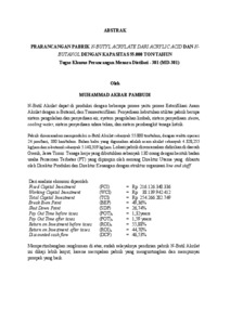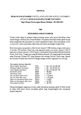 N-Butil Akrilat dapat di produksi dengan beberapa proses yaitu proses Esterifikasi Asam Akrilat dengan n-Butanol, dan Transesterifikasi. Penyediaan kebutuhan utilitas pabrik berupa sistem pengolahan dan penyediaan air, system pengolahan limbah, sistem penyediaan steam, cooling water, sistem penyediaan udara tekan, dan sistem pembangkit tenaga listrik. Pabrik direncanakan memproduksi n-Butil Akrilat sebanyak 55.000 ton/tahun, dengan waktu operasi 24 jam/hari, 330 hari/tahun. Bahan baku yang digunakan adalah asam akrilat sebanyak 4.328,255 kg/jam dan n-butanol sebanyak 5.140,319 kg/jam. Lokasi pabrik direncanakan didirikan di daerah Gresik, Jawa Timur. Tenaga kerja yang dibutuhkan sebanyak 130 orang dengan bentuk badan usaha Perseroan Terbatas (PT) yang dipimpin oleh seorang Direktur Utama yang dibantu oleh Direktur Produksi dan Direktur Keuangan dengan struktur organisasi line and staff. Dari analisis ekonomi diperoleh: Fixed Capital Investment (FCI) = Rp 216.126.340.336 Working Capital Investment (WCI) = Rp 38.139.942.412 Total Capital Investment (TCI) = Rp 254.266.282.749 Break Even Point (BEP) = 49,36% Shut Down Point (SDP) = 26,74% Pay Out Time before taxes (POT) b = 1,32years Pay Out Time after taxes (POT) a = 1,59 years Return on Investment before taxes (ROI) b = 55,88% Return on Investment after taxes (ROI) a = 44,70% Discounted cash flow (DCF) = 46,53% Mempertimbangkan rangkuman di atas, sudah selayaknya pendirian pabrik N-Butil Akrilat ini dikaji lebih lanjut, karena merupakan pabrik yang menguntungkan dan mempunyai prospek yang baik. N-Butil Acrylate can be produced through esterification of acrylic acid with n-butanol as well as transesterification processes. The factory's utilities include a water treatment and supply system, a wastewater treatment system, a steam supply system, cooling water, a compressed air supply system, and a power generation system. The factory is planned to produce 55,000 tons of n-butyl acrylate per year, operating 24 hours a day, 330 days a year. The raw materials used are 4.328,255 kg of acrylic acid per hour and 5.140,319 kg of hydrogen per hour. The factory is planned to be located in Gresik, East Java. The factory will require 130 workers, operating as a Limited Liability Company (PT), led by a President Director assisted by a Production Director and a Finance Director, with a line and staff organizational structure. From the economic analysis obtained: Fixed Capital Investment (FCI) = Rp 216.126.340.336 Working Capital Investment (WCI) = Rp 38.139.942.412 Total Capital Investment (TCI) = Rp 254.266.282.749 Break Even Point (BEP) = 49,36% Shut Down Point (SDP) = 26,74% Pay Out Time before taxes (POT) b = 1,32years Pay Out Time after taxes (POT) a = 1,59 years Return on Investment before taxes (ROI) b = 55,88% Return on Investment after taxes (ROI) a = 44,70% Discounted cash flow (DCF) = 46,53% Considering the above summary, it is appropriate that the establishment of this N-Butyl Acrylate plant should be studied further, because it is a profitable factory and has good prospects.