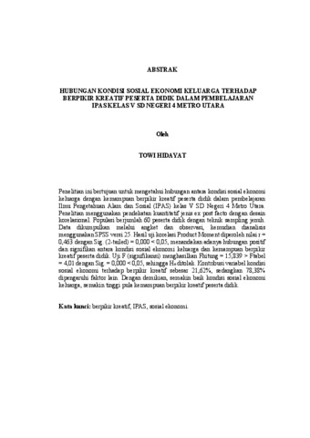HUBUNGAN KONDISI SOSIAL EKONOMI KELUARGA TERHADAP BERPIKIR KREATIF PESERTA DIDIK DALAM PEMBELAJARAN IPAS KELAS V SD NEGERI 4 METRO UTARA