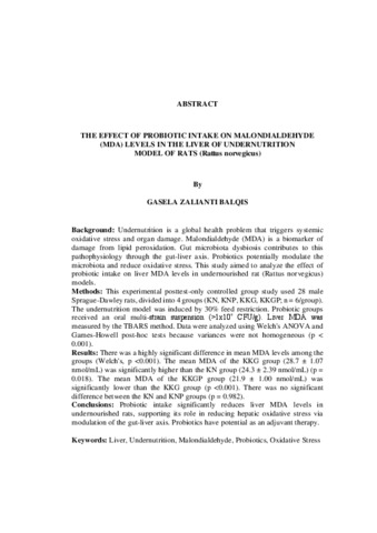 ZALIANTI BALQIS, GASELA (2025) PENGARUH ASUPAN PROBIOTIK TERHADAP KADAR MALONDIALDEHID (MDA) HEPAR TIKUS (Rattus norvegicus) MODEL KURANG GIZI. FAKULTAS KEDOKTERAN, UNIVERSITAS LAMPUNG.