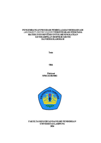 Fitriyani , Fitriyani (2026) PENGEMBANGAN PROGRAM PEMBELAJARAN BERBASIS ADI (ARGUMENT-DRIVEN INQUIRY)TERINTEGRASI STEM PADA MATERI FOTOSINTESIS UNTUK MENINGKATKAN KETERAMPILAN BERPIKIR KRITIS DAN BERKOLABORASI. Masters thesis, UNIVERSITAS LAMPUNG.