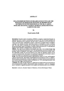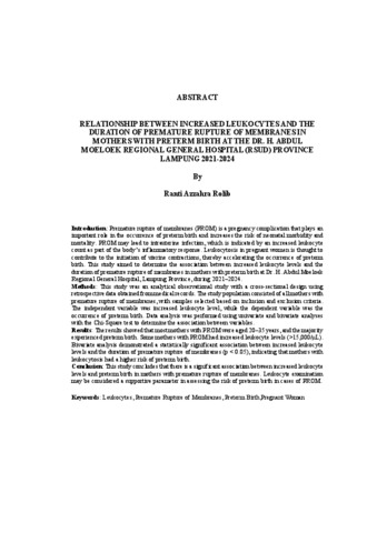 Ranti , Azzahra Rolib (2026) HUBUNGAN PENINGKATAN LEUKOSIT DENGAN LAMA KETUBAN PECAH DINI PADA IBU DENGAN PERSALINAN PREMATUR DI RUMAH SAKIT UMUM DAERAH (RSUD) DR. H. ABDUL MOELOEK PROVINSI LAMPUNG TAHUN 2021-2024. FAKULTAS KEDOKTERAN, UNIVERSITAS LAMPUNG.