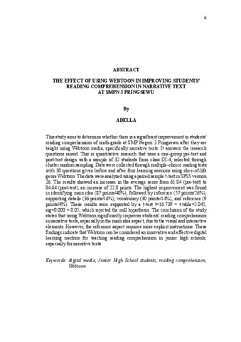 ADELLA, ADELLA (2026) THE EFFECT OF USING WEBTOON IN IMPROVING STUDENTS’ READING COMPREHENSION IN NARRATIVE TEXT AT SMPN 3 PRINGSEWU. FAKULTAS KEGURUAN DAN ILMU PENDIDIKAN, UNIVERSITAS LAMPUNG.