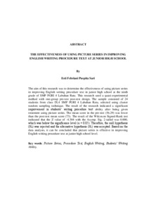 The aim of this research was to determine the effectiveness of using picture series in improving English writing procedure text in junior high school at the ninth-grade of SMP PGRI 4 Labuhan Ratu. This research used a quasi-experimental method with one-group pre-test post-test design. The sample consisted of 24 students from class IX.4 SMP PGRI 4 Labuhan Ratu, selected using cluster random sampling technique. The result of the research indicated a significant improvement in students' writing procedure text ability after being given treatment using picture series. The mean score in the pre-test (56.29) was lower than the post-test mean score (73). The result of the Wilcoxon Signed-Rank test indicated that the Z value of -4.304 with the Asymp. Sig. 2-tailed was 0.000, which was below the significance level (α = 0.05). Therefore, the null hypothesis (H₀) was rejected and the alternative hypothesis (H₁) was accepted. Based on the data analysis, it can be concluded that picture series is effective in improving English writing procedure text at junior high school level. Key words: Picture Series, Procedure Text, English Writing, Students' Writing Ability.