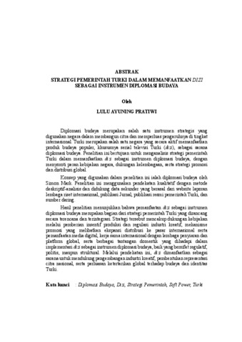 Diplomasi budaya merupakan salah satu instrumen strategis yang digunakan negara dalam membangun citra dan memperluas pengaruhnya di tingkat internasional. Turki merupakan salah satu negara yang secara aktif memanfaatkan produk budaya populer, khususnya serial televisi Turki (dizi), sebagai sarana diplomasi budaya. Penelitian ini bertujuan untuk menganalisis strategi pemerintah Turki dalam memanfaatkan dizi sebagai instrumen diplomasi budaya, dengan menyoroti peran kebijakan negara, dukungan kelembagaan, serta strategi promosi dan distribusi global. Konsep yang digunakan dalam penelitian ini ialah diplomasi budaya oleh Simon Mark. Penelitian ini menggunakan pendekatan kualitatif dengan metode deskriptif-analisis dan didukung data sekunder yang berasal dari website laporan lembaga riset internasional, publikasi Jurnal, publikasi resmi pemerintah Turki, dan sumber daring. Hasil penelitian menunjukkan bahwa pemanfaatan dizi sebagai instrumen diplomasi budaya merupakan bagian dari strategi pemerintah Turki yang dirancang secara terencana dan terintegrasi. Strategi tersebut mencakup dukungan kebijakan melalui pemberian insentif produksi dan regulasi industri kreatif, mekanisme promosi yang melibatkan ekspansi distribusi ke pasar internasional serta pemanfaatan media digital, kerja sama internasional dengan lembaga penyiaran dan platform global, serta berbagai tantangan domestik yang dihadapi dalam implementasi dizi sebagai instrumen diplomasi budaya, baik yang bersifat regulatif, politis, maupun struktural. Melalui pendekatan ini, dizi dimanfaatkan sebagai sarana untuk mendukung pengembangan industri kreatif, pembentukan representasi citra nasional, serta perluasan ketertarikan global terhadap budaya dan identitas Turki. Kata kunci : Diplomasi Budaya, Dizi, Strategi Pemerintah, Soft Power, Turki Cultural diplomacy is one of the strategic instruments used by countries to build their image and expand their influence at the international level. Turkey is one of the countries that actively utilizes popular cultural products, particularly Turkish television series (dizi), as a means of cultural diplomacy. This study aims to analyze the Turkish government's strategy in utilizing dizi as an instrument of cultural diplomacy, highlighting the role of state policy, institutional support, and global promotion and distribution strategies. The concept used in this study is cultural diplomacy by Simon Mark. This study uses a qualitative approach with descriptiveanalytical methods and is supported by secondary data from international research institution websites, journal publications, official Turkish government publications, and online sources. The results of the study show that the use of dizi as an instrument of cultural diplomacy is part of the Turkish government's carefully planned and integrated strategy. This strategy includes policy support through production incentives and creative industry regulations, promotional mechanisms involving distribution expansion to international markets and the use of digital media, international cooperation with broadcasting institutions and global platforms, as well as various domestic challenges faced in the implementation of dizi as an instrument of cultural diplomacy, whether regulatory, political, or structural in nature. Through this approach, dizi is used as a means to support the development of the creative industry, the formation of national image representation, and the expansion of global interest in Turkish culture and identity. Keywords : Cultural Diplomacy, Dizi, Government Strategy, Soft Power, Turkey