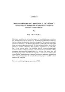 VINTY ECHI GLEDISA , LASE (2026) PEMODELAN JADWAL APOTEKER DI INSTALASI FARMASI RUMAH SAKIT UMUM KABANJAHE DENGAN MENGGUNAKAN METODE INTEGER PROGRAMMING. MATEMATIKA DAN ILMU PENGETAHUAN ALAM, UNIVERSITAS LAMPUNG.