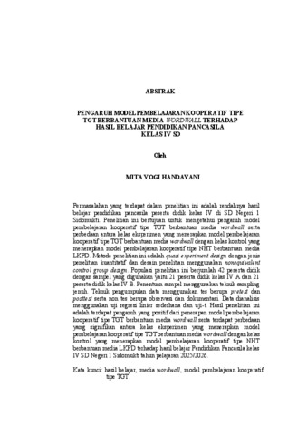 Permasalahan yang terdapat dalam penelitian ini adalah rendahnya hasil belajar pendidikan pancasila peserta didik kelas IV di SD Negeri 1 Sidomukti. Penelitian ini bertujuan untuk mengetahui pengaruh model pembelajaran kooperatif tipe TGT berbantuan media wordwall serta perbedaan antara kelas eksperimen yang menerapkan model pembelajaran kooperatif tipe TGT berbantuan media wordwall dengan kelas kontrol yang menerapkan model pembelajaran kooperatif tipe NHT berbantuan media LKPD. Metode penelitian ini adalah quasi experiment design dengan jenis penelitian kuantitatif dan desain penelitian menggunakan nonequivalent control group design. Populasi penelitian ini berjumlah 42 peserta didik dengan sampel yang digunakan yaitu 21 peserta didik kelas IV A dan 21 peserta didik kelas IV B. Penentuan sampel menggunakan teknik sampling jenuh. Teknik pengumpulan data menggunakan tes berupa pretest dan posttest serta non tes berupa observasi dan dokumentasi. Data dianalisis menggunakan uji regresi linier sederhana dan uji-t. Hasil penelitian ini adalah terdapat pengaruh yang positif dari penerapan model pembelajaran kooperatif tipe TGT berbantuan media wordwall serta terdapat perbedaan yang signifikan antara kelas eksperimen yang menerapkan model pembelajaran kooperatif tipe TGT berbantuan media wordwall dengan kelas kontrol yang menerapkan model pembelajaran kooperatif tipe NHT berbantuan media LKPD terhadap hasil belajar Pendidikan Pancasila kelas IV SD Negeri 1 Sidomukti tahun pelajaran 2025/2026. Kata kunci: hasil belajar, media wordwall, model pembelajaran kooperatif tipe TGT. The problem found in this study was the low learning outcomes of pendidikanpancasila students grade IV at SD Negeri 1 Sidomukti. This study aims todetermine the effect of the cooperative learning model type TGT assisted bywordwall media, as well as the difference between the experimental class thaapplied the TGT cooperative learning model assisted by wordwall media andthe control class that applied the NHT cooperative learning model assisted byLKPD media. This research employed a quasi-experimental method with aquantitative approach and a nonequivalent control group design. Thepopulation consisted of 42 students, with a sample of 21 students from class IV A and 21 students from class IV B. The sampling technique used was saturatedsampling. Data were collected through tests (pretest and posttest) and non-tesmethods (observation and documentation). The data were analyzed using simple linear regression and t-test. The results of this study show that there is apositive effect of implementing the TGT cooperative learning model assistedby wordwall media, and there is a significant difference between theexperimental class using the TGT model assisted by wordwall media and thecontrol class using the NHT model assisted by LKPD media on the learningoutcomes of pendidikan pancasila class IV at SD Negeri 1 Sidomukti in the2025/2026 academic year. Keywords: learning outcomes, wordwall media, cooperative learning model type TGT.