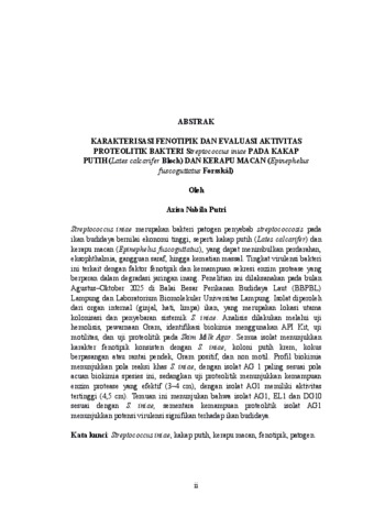 KARAKTERISASI FENOTIPIK DAN EVALUASI AKTIVITAS PROTEOLITIK BAKTERI Streptococcus iniae PADA KAKAP PUTIH (Lates calcarifer Bloch) DAN KERAPU MACAN (Epinephelus fuscoguttatus Forsskål)