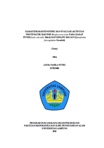 AZISA NABILA, PUTRI (2026) KARAKTERISASI FENOTIPIK DAN EVALUASI AKTIVITAS PROTEOLITIK BAKTERI Streptococcus iniae PADA KAKAP PUTIH (Lates calcarifer Bloch) DAN KERAPU MACAN (Epinephelus fuscoguttatus Forsskål). Masters thesis, UNIVERSITAS LAMPUNG.