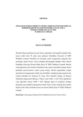 Masalah dalam penelitian ini yaitu belum optimalnya keterampilan berpikir kritis peserta didik kelas IV pada mata pelajaran Pendidikan Pancasila di SDIT Wahdatul Ummah. Penelitian ini bertujuan untuk menganalisis pengaruh dari penerapan model Project Citizen terhadap Keterampilan Berpikir Kritis Materi Pendidikan Pancasila Peserta Didik Kelas IV SDIT Wahdatul Ummah. Metode yang digunakan yaitu metode eksperimen semu (quasi experiment) dengan desain penelitian pretest-posttest control group design. Teknik pengambilan sampel penelitian ini menggunakan teknik non probability sampling dengan populasi dan sempel penelitian ini sebanyak 58 orang. Data dianalisis dengan uji Regresi Sederhana dengan hasil Fhitung > Ftabel, yaitu 36,081 > 4,20. Nilai signifikansi yang diperoleh sebesar 0,000 < 0,05 sehingga dapat di simpulkan terdapat pengaruh yang signifikan penggunaan Model Project Citizen Terhadap Keterampilan Berpikir Kritis Materi Pendidikan Pancasila Peserta Didik Kelas IV SDIT Wahdatul Ummah. Kata Kunci : Kemampuan Berpikir Kritis, Pendidikan Pancasila, Project Citizen.