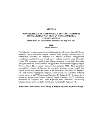 Penelitian ini bertujuan untuk mengetahui pengaruh self-esteem dan self-efficacy terhadap kinerja karyawan dengan kepuasan kerja sebagai mediasi pada PT Perkebunan Nusantara IV Regional VII. Metode penelitian menggunakan pendekatan kuantitatif dengan teknik survei melalui kuesioner yang dibagikan kepada 158 responden. Analisis data dilakukan dengan regresi linier berganda. Pengujian hipotesis akan dilakukan menggunakan metode Bootstrapping dengan Process Macro Hayes sebagai ekstensi pada program SPSS. Hasil penelitian menunjukkan bahwa Self-esteem berpengaruh langsung secara positif dan signifikan terhadap kinerja karyawan di PT Perkebunan Nusantara IV Regional VII. Self-efficacy berpengaruh langsung secara positif dan signifikan terhadap kinerja karyawan di PT Perkebunan Nusantara IV Regional VII. Kepuasan kerja memediasi pengaruh self-esteem terhadap kinerja karyawan di PT Perkebunan Nusantara IV Regional VII. Serta Kepuasan kerja memediasi self-efficacy terhadap kinerja karyawan di PT Perkebunan Nusantara IV Regional VII. Kata Kunci: Self-Esteem, Self-Efficacy, Kinerja Karyawan, Kepuasan Kerja. This study aims to determine the influence of self-esteem and self-efficacy on employee performance with job satisfaction as a mediating variable at PT Perkebunan Nusantara IV Regional VII. The research employed a quantitative approach using a survey method with questionnaires distributed to 158 respondents. Data were analyzed using multiple linear regression. Hypothesis testing was conducted using the Bootstrapping method with Hayes’ Process Macro as an extension in the SPSS program. The results indicate that self-esteem has a direct positive and significant effect on employee performance at PT Perkebunan Nusantara IV Regional VII. Self-efficacy also has a direct positive and significant effect on employee performance at PT Perkebunan Nusantara IV Regional VII. Furthermore, job satisfaction mediates the influence of self-esteem on employee performance, and it also mediates the influence of self-efficacy on employee performance at PT Perkebunan Nusantara IV Regional VII. Keywords: Self-Esteem, Self-Efficacy, Employee Performance, Job Satisfaction.