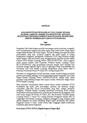 Fitri, Agustina (2026) ANALISIS PUTUSAN PENGADILAN TATA USAHA NEGARA BANDAR LAMPUNG NOMOR 33/G/2023/PTUN.BL TENTANG PENJATUHAN HUKUMAN DISIPLIN BAGI PEGAWAI NEGERI SIPIL BERUPA PEMBEBASAN JABATAN FUNGSIONAL. FAKULTAS HUKUM, UNIVERSITAS LAMPUNG.