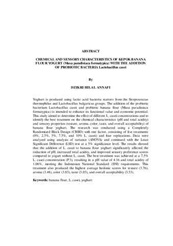 Yoghurt is produced using lactic acid bacteria starters from the Streptococcus thermophilus and Lactobacillus bulgaricus groups. The addition of the probiotic bacterium Lactobacillus casei and prebiotic banana flour (Musa paradisiaca formatypica) is intended to enhance its functional value and economic potential. This study aimed to determine the effect of different L. casei concentrations and to identify the best treatment on the chemical characteristics (pH and total acidity) and sensory properties (texture, aroma, color, taste, and overall acceptability) of banana flour yoghurt. The research was conducted using a Completely Randomized Block Design (CRBD) with one factor, consisting of five treatments (0%, 2.5%, 5%, 7.5%, and 10% L. casei) and four replications. Data were analyzed using analysis of variance (ANOVA) and continued with the Least Significant Difference (LSD) test at a 5% significance level. The results showed that the addition of L. casei to banana flour yoghurt significantly affected the reduction of pH, increased total acidity, and improved sensory preference scores compared to yogurt without L. casei. The best treatment was achieved at a 7.5% L. casei concentration (P3), resulting in a pH value of 4.16 and total acidity of 1.06%, meeting the Indonesian National Standard (SNI) requirements. This treatment also produced the highest average hedonic scores for texture (3.76), aroma (3.48), color (3.83), taste (3.03), and overall acceptability (3.53). Keywords: banana flour, L. casei, yoghurt Yogurt dibuat dengan bantuan starter bakteri asam laktat dari golongan Streptococcus thermophilus dan Lactobacillus bulgaricus. Penambahan bakteri probiotik Lactobacillus casei dan prebiotik tepung pisang kepok (Musa paradisiaca formatypica) digunakan untuk meningkatkan nilai fungsional serta nilai ekonomis produksinya. Penelitian ini bertujuan untuk mengetahui pengaruh penambahan konsentrasi L. casei yang berbeda serta menentukan perlakuan terbaik terhadap karakteristik kimia (pH dan total asam) dan sifat sensori (tekstur, aroma, warna, rasa, dan penerimaan keseluruhan) yogurt tepung pisang kepok. Penelitian disusun dengan metode Rancangan Acak Kelompok Lengkap (RAKL) satu faktor dengan lima perlakuan (0%, 2,5%, 5%, 7,5%, dan 10% L. casei) dan empat ulangan. Data dianalisis menggunakan sidik ragam (ANARA) dan dilanjutkan dengan uji Beda Nyata Terkecil (BNT) pada taraf 5%. Hasil penelitian menunjukkan bahwa yogurt tepung pisang kepok dengan penambahan L. casei berpengaruh nyata terhadap penurunan pH, peningkatan total asam, dan meningkatkan skor kesukaan sensori dibandingkan tanpa penambahan L. casei. Perlakuan terbaik diperoleh pada yogurt tepung pisang kepok konsentrasi L. casei 7,5% (P3) dengan nilai pH 4,16 dan total asam 1,06% sesuai syarat SNI, serta skor rata-rata hedonik tertinggi untuk tekstur (3,76), aroma (3,48), warna (3,83), rasa (3,03), dan penerimaan keseluruhan (3,53). Kata Kunci: L. casei, tepung pisang kepok, yogurt