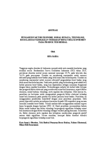 Tingginya angka obesitas di Indonesia menjadi salah satu masalah kesehatan yang semakin serius. Berdasarkan Survei Kesehatan Indonesia (SKI) tahun 2023, prevalensi obesitas sentral secara nasional mencapai 19,7% pada laki-laki dan 54,1% pada perempuan. Kondisi ini mendorong masyarakat untuk mencari alternatif pengendalian berat badan yang lebih aman dan berkelanjutan. Kondisi ini mendorong masyarakat untuk mencari alternatif pengendalian berat badan yang lebih aman dan berkelanjutan. Salah satu produk yang berkembang pesat adalah teh herbal penurun berat badan, yang kini diposisikan sebagai minuman fungsional dengan klaim manfaat kesehatan. Perkembangan industri teh herbal tidak terlepas dari pengaruh faktor eksternal yang membentuk minat beli konsumen, seperti faktor ekonomi, sosial budaya, teknologi, serta regulasi dan kebijakan. Oleh karena itu, penelitian ini bertujuan untuk menganalisis pengaruh faktor eksternal terhadap minat beli konsumen pada produk teh herbal penurun berat badan. Penelitian ini menggunakan pendekatan kuantitatif dengan jenis penelitian penjelasan. Data primer diperoleh melalui penyebaran kuesioner kepada 100 responden yang merasa memiliki masalah berat badan. Teknik analisis data menggunakan analisis regresi linear berganda dengan bantuan SPSS 26. Hasil penelitian menunjukkan bahwa faktor sosial budaya dan faktor teknologi berpengaruh signifikan terhadap minat beli konsumen dengan faktor teknologi sebagai variabel paling dominan. Sementara itu, faktor ekonomi serta regulasi dan kebijakan memberikan pengaruh positif namun tidak signifikan. Secara simultan, keempat faktor tersebut terbukti berpengaruh signifikan terhadap minat beli. Kata kunci: Obesitas, Teh Herbal Penurun Berat Badan, Faktor Eksternal, Minat Beli Konsumen