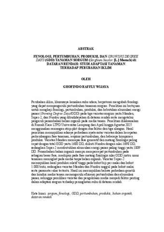 Ghofindo, Raffly Wijaya (2026) FENOLOGI, PERTUMBUHAN, PRODUKSI, DAN GROWING DEGREE DAYS (GDD) TANAMAN SORGUM (Sorghum bicolor [L.] Moench) di DATARAN RENDAH: STUDI ADAPTASI TANAMAN TERHADAP PERUBAHAN IKLIM. FAKULTAS PERTANIAN, UNIVERSITAS LAMPUNG.
