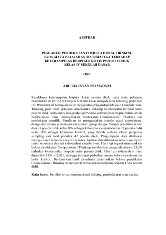 ARCILIA INTAN , PERMADANI (2026) PENGARUH PENDEKATAN COMPUTATIONAL THINKING PADA MATA PELAJARAN MATEMATIKA TERHADAP KETERAMPILAN BERPIKIR KRITIS PESERTA DIDIK KELAS IV SEKOLAH DASAR. FAKULTAS KEGURUAN DAN ILMU PENDIDIKAN, UNIVERSITAS LAMPUNG.