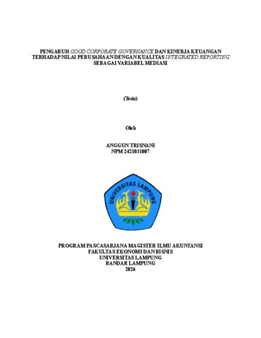 Anggun, Trisnani (2026) Pengaruh Good Corporate Governance dan Kinerja Keuangan terhadap Nilai Perusahaan dengan Kualitas Integrated Reporting sebagai Variabel Mediasi. Masters thesis, UNIVERSITAS LAMPUNG.