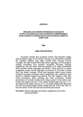 ASMA , NISA HANIFAH (2025) PEMANFAATAN SISTEM INFORMASI GEOGRAFIS UNTUK ANALISIS KUALITAS LINGKUNGAN PERMUKIMAN DI KECAMATAN LABUHAN RATU KOTA BANDAR LAMPUNG TAHUN 2025. FAKULTAS KEGURUAN DAN ILMU PENDIDIKAN, UNIVERSITAS LAMPUNG.