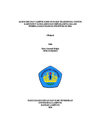 Syira Amanah , Balqis (2026) ALIH KODE DAN CAMPUR KODE DI PASAR TRADISIONAL GISTING KABUPATEN TANGGAMUS DAN IMPLIKASINYA DALAM PEMBELAJARAN BAHASA INDONESIA DI SMA. FAKULTAS KEGURUAN DAN ILMU PENDIDIKAN, UNIVERSITAS LAMPUNG.