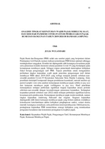 JULIA , WULANDARI (2026) ANALISIS TINGKAT KEPATUHAN WAJIB PAJAK SEBELUM, SAAT, DAN SESUDAH PANDEMI COVID-19 (STUDI PEMBAYARAN PAJAK BUMI DAN BANGUNAN TAHUN 2019-2024 DI BANDAR LAMPUNG). FAKULTAS ILMU SOSIAL DAN ILMU POLITIK, UNIVERSITAS LAMPUNG.