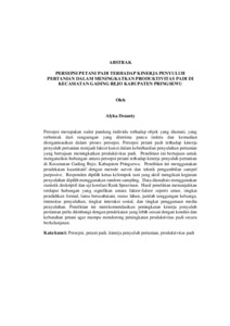 Persepsi merupakan sudut pandang individu terhadap objek yang diamati, yang terbentuk dari rangsangan yang diterima panca indera dan kemudian diorganisasikan dalam proses persepsi. Persepsi petani padi terhadap kinerja penyuluh pertanian menjadi faktor kunci dalam keberhasilan penyuluhan pertanian yang bertujuan meningkatkan produktivitas padi. Penelitian ini bertujuan untuk menganalisis hubungan antara persepsi petani terhadap kinerja penyuluh pertanian di Kecamatan Gading Rejo, Kabupaten Pringsewu. Penelitian ini menggunakan pendekatan kuantitatif dengan metode survei dan teknik pengambilan sampel purposive. Responden dipilih ketua kelompok tani yang aktif mengikuti kegiatan penyuluhan dipilih menggunakan random sampling. Data dianalisis menggunakan statistik deskriptif dan uji korelasi Rank Spearman. Hasil penelitian menunjukkan terdapat hubungan yang signifikan antara faktor-faktor seperti umur, tingkat pendidikan formal, lama berusahatani, status lahan, jumlah tanggungan keluarga, intensitas penyuluhan, tingkat interaksi sosial, dan tingkat penggunaan media penyuluhan. Penelitian ini merekomendasikan peningkatan kinerja penyuluh pertanian perlu diimbangi dengan pendekatan yang lebih sesuai dengan kondisi dan kebutuhan petani agar mampu mendorong peningkatan produktivitas padi secara berkelanjutan. Kata kunci: Persepsi, petani padi, kinerja penyuluh pertanian, produktivitas padi Perception refers to an individual’s perspective toward an observed object, which is formed through stimuli received by the senses and subsequently organized through the perceptual process. Rice farmers’ perceptions of agricultural extension workers’ performance are a key factor in the success of agricultural extension aimed at improving rice productivity. This study aims to analyze the relationship between farmers’ perceptions and the performance of agricultural extension workers in Gading Rejo District, Pringsewu Regency. This study employed a quantitative approach using a survey method with purposive sampling. The respondents consisted of heads of farmer groups who actively participated in extension activities and were selected using random sampling. Data were analyzed using descriptive statistics and the Spearman Rank correlation test. The results indicate that there are significant relationships between farmers’ perceptions and several factors, including age, level of formal education, length of farming experience, land tenure status, number of household dependents, intensity of extension activities, level of social interaction, and level of extension media utilization. This study recommends that improvements in the performance of agricultural extension workers should be accompanied by approaches that are better aligned with farmers’ conditions and needs in order to promote sustainable increases in rice productivity Keywords: Perception, rice farmers, agricultural extension workers, performance, rice productivity