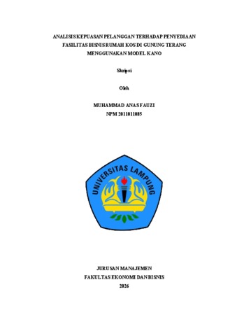 Muhammad Anas, Fauzi (2026) ANALISIS KEPUASAN PELANGGAN TERHADAP PENYEDIAAN FASILITAS BISNIS RUMAH KOS DI GUNUNG TERANG MENGGUNAKAN MODEL KANO. FAKULTAS EKONOMI DAN BISNIS, UNIVERSITAS LAMPUNG.