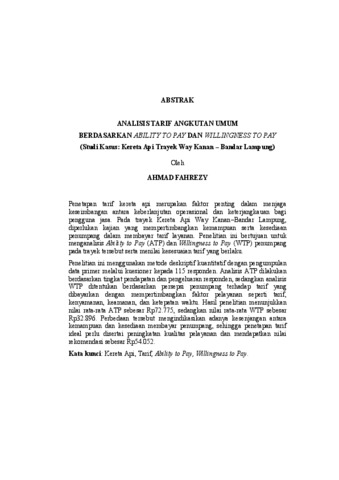 FAHREZY, AHMAD (2026) ANALISIS TARIF ANGKUTAN UMUM BERDASARKAN ABILITY TO PAY DAN WILLINGNESS TO PAY (Studi Kasus: Kereta Api Trayek Way Kanan – Bandar Lampung). FAKULTAS TEKNIK, UNIVERSITAS LAMPUNG.