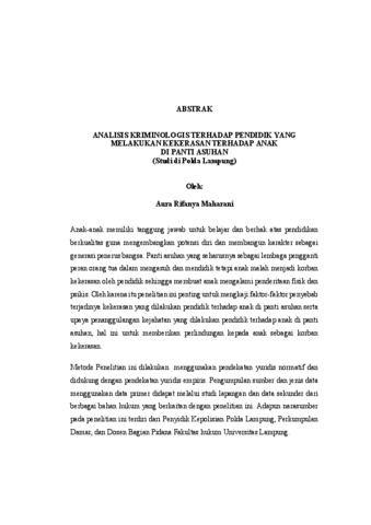 Anak-anak memiliki tanggung jawab untuk belajar dan berhak atas pendidikan berkualitas guna mengembangkan potensi diri dan membangun karakter sebagai generasi penerus bangsa. Panti asuhan yang seharusnya sebagai lembaga pengganti peran orang tua dalam mengasuh dan mendidik tetapi anak malah menjadi korban kekerasan oleh pendidik sehingga membuat anak mengalami penderitaan fisik dan psikis. Oleh karena itu penelitian ini penting untuk mengkaji faktor-faktor penyebab terjadinya kekerasan yang dilakukan pendidik terhadap anak di panti asuhan serta upaya penanggulangan kejahatan yang dilakukan pendidik terhadap anak di panti asuhan, hal ini untuk memberikan perlindungan kepada anak sebagai korban kekerasan. Metode Penelitian ini dilakukan menggunakan pendekatan yuridis normatif dan didukung dengan pendekatan yuridis empiris. Pengumpulan sumber dan jenis data menggunakan data primer didapat melalui studi lapangan dan data sekunder dari berbagai bahan hukum yang berkaitan dengan penelitian ini. Adapun narasumber pada penelitian ini terdiri dari Penyidik Kepolisian Polda Lampung, Perkumpulan Damar, dan Dosen Bagian Pidana Fakultas hukum Universitas Lampung.Aura Rifanya Maharani Hasil penelitian dan pembahasan dapat disimpulkan bahwa kejahatan kekerasan yang dilakukan pendidik di panti asuhan merupakan kejahatan yang serius yang dipengaruhi oleh kurangnya kontrol emosi, minimnya pemahaman psikologi perkembangan anak, serta latar belakang pribadi yang pernah mengalami kekerasan, sehingga membentuk pola pendidikan yang represif. Oleh karena itu upaya penanggulangannya dilakukan melalui sarana penal berupa penegakan hukum untuk memberikan efek jera, serta sarana non-penal melalui sosialisasi dan pemberdayaan anak oleh Dinas Sosial Kota Bandar Lampung. Saran yang penulis berikan adalah pihak panti asuhan perlu memperkuat pengawasan internal-eksternal komprehensif untuk tingkatkan kualitas pendidikan. dan dinas sosial perlu langkah efektif mencegah kekerasan di panti asuhan melalui rekrutmen ketat seperti membuat program sosialisasi dan pelatihan perlindungan anak bagi pengelola panti, pendidik, dan anak asuh. Selain itu diharapkan aparat penegak hukum dapat menegakan hukum yang tegas guna memberikan efek jera terhadap pelaku kejahatan dan melakukan pembinaan agar pelaku tidak kembali melakukan kejahatan. Kata Kunci: Kriminologis, Kekerasan Anak, Panti Asuhan