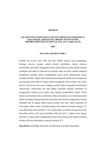 UJI AKTIVITAS ENZIM SELULASE DAN PROTEASE DARI ISOLAT KOLAM BAK AERASI PADA PROSES WASTE WATER PRETREATMENT PLANT DI PT JUANG JAYA ABDI ALAM