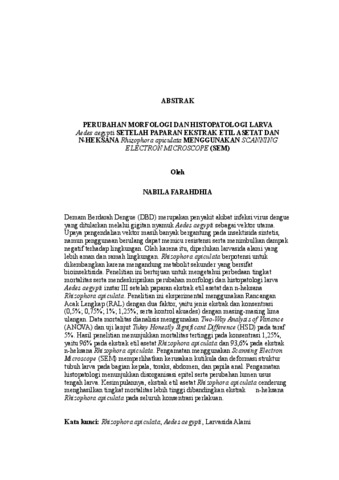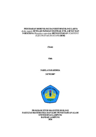 Nabila, Farahdhia (2026) PERUBAHAN MORFOLOGI DAN HISTOPATOLOGI LARVA Aedes aegypti SETELAH PAPARAN EKSTRAK ETIL ASETAT DAN N-HEKSANA Rhizophora apiculata MENGGUNAKAN SCANNING ELECTRON MICROSCOPE (SEM). Masters thesis, UNIVERSITAS LAMPUNG.