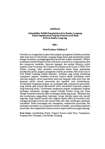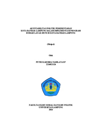 PUTRI KARISMA , NABILATAS P (2026) AKUNTABILITAS POLITIK PEMERINTAHAN KOTA BANDAR LAMPUNG DALAM IMPLEMENTASI PROGRAM RUMAH LAYAK HUNI DI KOTA BANDAR LAMPUNG. FAKULTAS ILMU SOSIAL DAN ILMU POLITIK , UNIVERSITAS LAMPUNG.