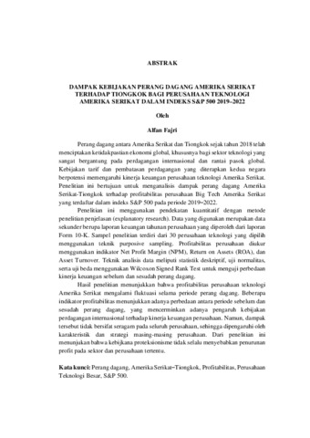 Perang dagang antara Amerika Serikat dan Tiongkok sejak tahun 2018 telah menciptakan ketidakpastian ekonomi global, khususnya bagi sektor teknologi yang sangat bergantung pada perdagangan internasional dan rantai pasok global. Kebijakan tarif dan pembatasan perdagangan yang diterapkan kedua negara berpotensi memengaruhi kinerja keuangan perusahaan teknologi Amerika Serikat. Penelitian ini bertujuan untuk menganalisis dampak perang dagang Amerika Serikat-Tiongkok terhadap profitabilitas perusahaan Big Tech Amerika Serikat yang terdaftar dalam indeks S&P 500 pada periode 2019–2022. Penelitian ini menggunakan pendekatan kuantitatif dengan metode penelitian penjelasan (explanatory research). Data yang digunakan merupakan data sekunder berupa laporan keuangan tahunan perusahaan yang diperoleh dari laporan Form 10-K. Sampel penelitian terdiri dari 30 perusahaan teknologi yang dipilih menggunakan teknik purposive sampling. Profitabilitas perusahaan diukur menggunakan indikator Net Profit Margin (NPM), Return on Assets (ROA), dan Asset Turnover. Teknik analisis data meliputi statistik deskriptif, uji normalitas, serta uji beda menggunakan Wilcoxon Signed Rank Test untuk menguji perbedaan kinerja keuangan sebelum dan sesudah perang dagang. Hasil penelitian menunjukkan bahwa profitabilitas perusahaan teknologi Amerika Serikat mengalami fluktuasi selama periode perang dagang. Beberapa indikator profitabilitas menunjukkan adanya perbedaan antara periode sebelum dan sesudah perang dagang, yang mencerminkan adanya pengaruh kebijakan perdagangan internasional terhadap kinerja keuangan perusahaan. Namun, dampak tersebut tidak bersifat seragam pada seluruh perusahaan, sehingga dipengaruhi oleh karakteristik dan strategi masing-masing perusahaan. Dari penelitian ini menunjukan bahwa kebijkana proteksionisme tidak selalu menyebabkan penurunan profit pada sektor dan perusahaan tertentu. Kata kunci: Perang dagang, Amerika Serikat–Tiongkok, Profitabilitas, Perusahaan Teknologi Besar, S&P 500.