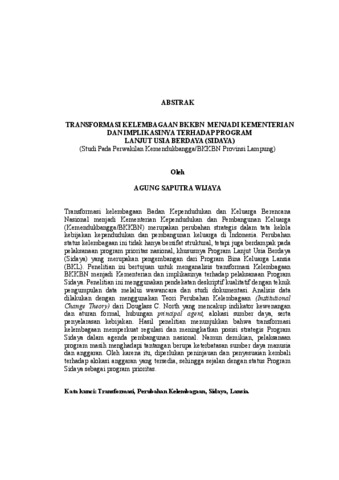 AGUNG , SAPUTRA WIJAYA (2026) TRANSFORMASI KELEMBAGAAN BKKBN MENJADI KEMENTERIAN DAN IMPLIKASINYA TERHADAP PROGRAM LANJUT USIA BERDAYA (SIDAYA) (Studi Pada Perwakilan Kemendukbangga/BKKBN Provinsi Lampung). FAKULTAS ILMU SOSIAL DAN ILMU POLITIK , UNIVERSITAS LAMPUNG.