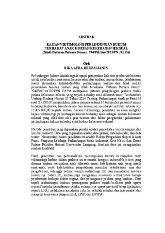 RIKA AFRA , HERZALIANTY (2026) KAJIAN VIKTIMOLOGI PERLINDUNGAN HUKUM TERHADAP ANAK KORBAN KEKERASAN SEKSUAL (Studi Putusan Perkara Nomor: 294/Pid.Sus/2023/PN Jkt.Pst). FAKULTAS HUKUM, UNIVERSITAS LAMPUNG.