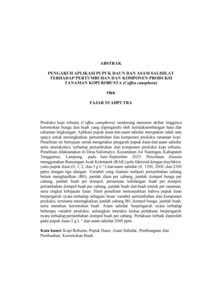 Produksi kopi robusta (Coffea canephora) cenderung menurun akibat tingginya kerontokan bunga dan buah yang dipengaruhi oleh ketidakseimbangan hara dan cekaman lingkungan. Aplikasi pupuk daun dan asam salisilat merupakan salah satu upaya untuk meningkatkan pertumbuhan dan komponen produksi tanaman kopi. Penelitian ini bertujuan untuk mengetahui pengaruh pupuk daun dan asam salisilat serta interaksinya terhadap pertumbuhan dan komponen produksi kopi robusta. Penelitian dilaksanakan di Desa Sidomulyo, Kecamatan Air Naningan, Kabupaten Tanggamus, Lampung, pada Juni–September 2025. Percobaan disusun menggunakan Rancangan Acak Kelompok (RAK) pola faktorial dengan dua faktor, yaitu pupuk daun (0, 1, 2, dan 3 g L⁻¹) dan asam salisilat (0, 1500, 2000, dan 2500 ppm) dengan tiga ulangan. Variabel yang diamati meliputi pertambahan cabang belum menghasilkan (B0), jumlah daun per cabang, jumlah dompol bunga per cabang, jumlah buah per dompol, persentase kehilangan buah per dompol, pertambahan dompol buah per cabang, jumlah buah dan buah rontok per tanaman, serta tingkat kehijauan daun. Hasil penelitian menunjukkan bahwa pupuk daun berpengaruh nyata terhadap sebagian besar variabel pertumbuhan dan komponen produksi, terutama meningkatkan jumlah cabang B0, dompol bunga, jumlah buah, serta menekan kerontokan buah. Asam salisilat berpengaruh nyata terhadap beberapa variabel produksi, sedangkan interaksi kedua perlakuan berpengaruh nyata terhadap pertambahan dompol buah per cabang. Perlakuan terbaik diperoleh pada pupuk daun 2 g L⁻¹ dan asam salisilat 2000 ppm.