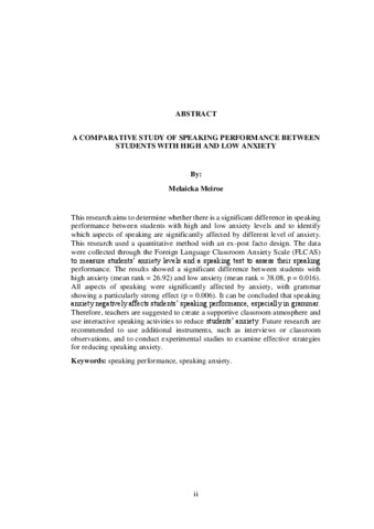 Melaicka , Meiroe (2026) A COMPARATIVE STUDY OF SPEAKING PERFORMANCE BETWEEN STUDENTS WITH HIGH AND LOW ANXIETY. FAKULTAS KEGURUAN DAN ILMU PENDIDIKAN, UNIVERSITAS LAMPUNG.
