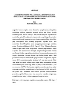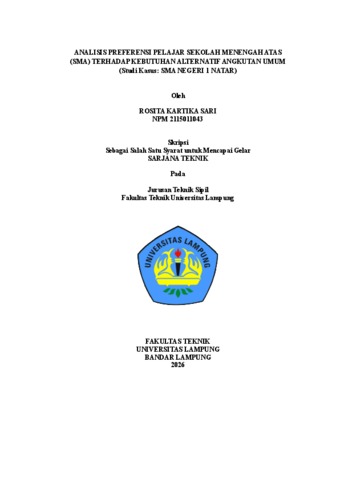 ROSITA, KARTIKA SARI (2026) ANALISIS PREFERENSI PELAJAR SEKOLAH MENENGAH ATAS (SMA) TERHADAP KEBUTUHAN ALTERNATIF ANGKUTAN UMUM ( Studi Kasus: SMA NEGERI 1 NATAR). FAKULTAS TEKNIK, UNIVERSITAS LAMPUNG.