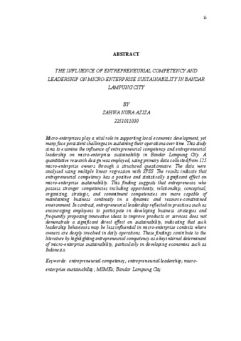 Zahwa Nura, Aziza (2026) THE INFLUENCE OF ENTREPRENEURIAL COMPETENCY AND LEADERSHIP ON MICRO-ENTERPRISE SUSTAINABILITY IN BANDAR LAMPUNG CITY. Ekonomi dan Bisnis, Universitas Lampung.