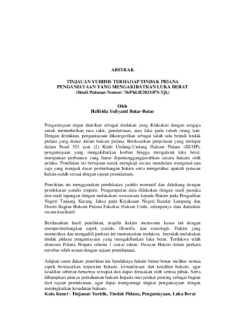 Helfrida , Yuliyanti Butar Butar (2026) TINJAUAN YURIDIS TERHADAP TINDAK PIDANA PENGANIAYAAN YANG MENGAKIBATKAN LUKA BERAT (Studi Putusan Nomor: 76/Pid.B/2025/PN Tjk). FAKULTAS HUKUM , UNIVERSITAS LAMPUNG.