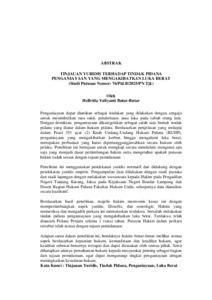 Penganiayaan dapat diartikan sebagai tindakan yang dilakukan dengan sengaja untuk menimbulkan rasa sakit, penderitaan, atau luka pada tubuh orang lain. Dengan demikian, penganiayaan dikategorikan sebagai salah satu bentuk tindak pidana yang diatur dalam hukum pidana. Berdasarkan penjelasan yang terdapat dalam Pasal 351 ayat (2) Kitab Undang-Undang Hukum Pidana (KUHP), penganiayaan yang mengakibatkan korban hingga mengalami luka berat, merupakan perbuatan yang harus dipertanggungjawabkan secara hukum oleh pelaku. Penelitian ini bertujuan untuk mengkaji secara mendalam mengenai apa saja yang menjadi dasar pertimbangan hakim serta mengetahui apakah putusan hakim sudah sesuai dengan tujuan pemidanaan. Penelitian ini menggunakan pendekatan yuridis normatif dan didukung dengan pendekatan yuridis empiris. Pengumpulan data dilakukan dengan studi pustaka dan studi lapangan dengan melakukan wawancara kepada Hakim pada Pengadilan Negeri Tanjung Karang, Jaksa pada Kejaksaan Negeri Bandar Lampung dan Dosen Bagian Hukum Pidana Fakultas Hukum Unila, selanjutnya data dianalisis secara kualitatif. Berdasarkan hasil penelitian, majelis hakim memvonis kasus ini dengan mempertimbangkan aspek yuridis, filosofis, dan sosiologis. Hakim yang memeriksa dan mengadili perkara ini memutuskan terdakwa bersalah melakukan tindak pidana penganiayaan yang mengakibatkan luka berat. Terdakwa telah diancam Pidana Penjara selama 1 (satu) tahun. Putusan Hakim dalam perkara tersebut telah sesuai dengan tujuan pemidanaan. Adapun saran dalam penelitian ini, hendaknya hakim benar-benar melihat semua aspek berdasarkan kepastian hukum, kemanfataan dan keadilan hukum, agar keadilan sebenar-benarnya tercapai dan dapat dirasakan oleh semua pihak. Serta diharapkan adanya pemahaman hukum kepada masyarakat penting sebagai bagian dari tujuan pemidanaan, agar dapat mengurangi tingkat penganiayaan dengan meningkatkan kesadaran hukum. Kata Kunci : Tinjauan Yuridis, Tindak Pidana, Penganiayaan, Luka Berat